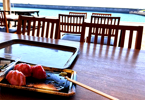 せっかく来たので、捌かれたばかりのマグロを、海を眺めながらいただきました!